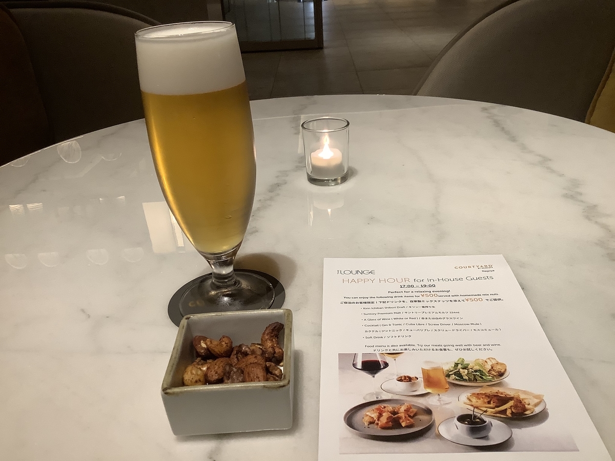 ラウンジでハッピーアワー、500円で生ビールとナッツ、夕食まで楽しみます♪