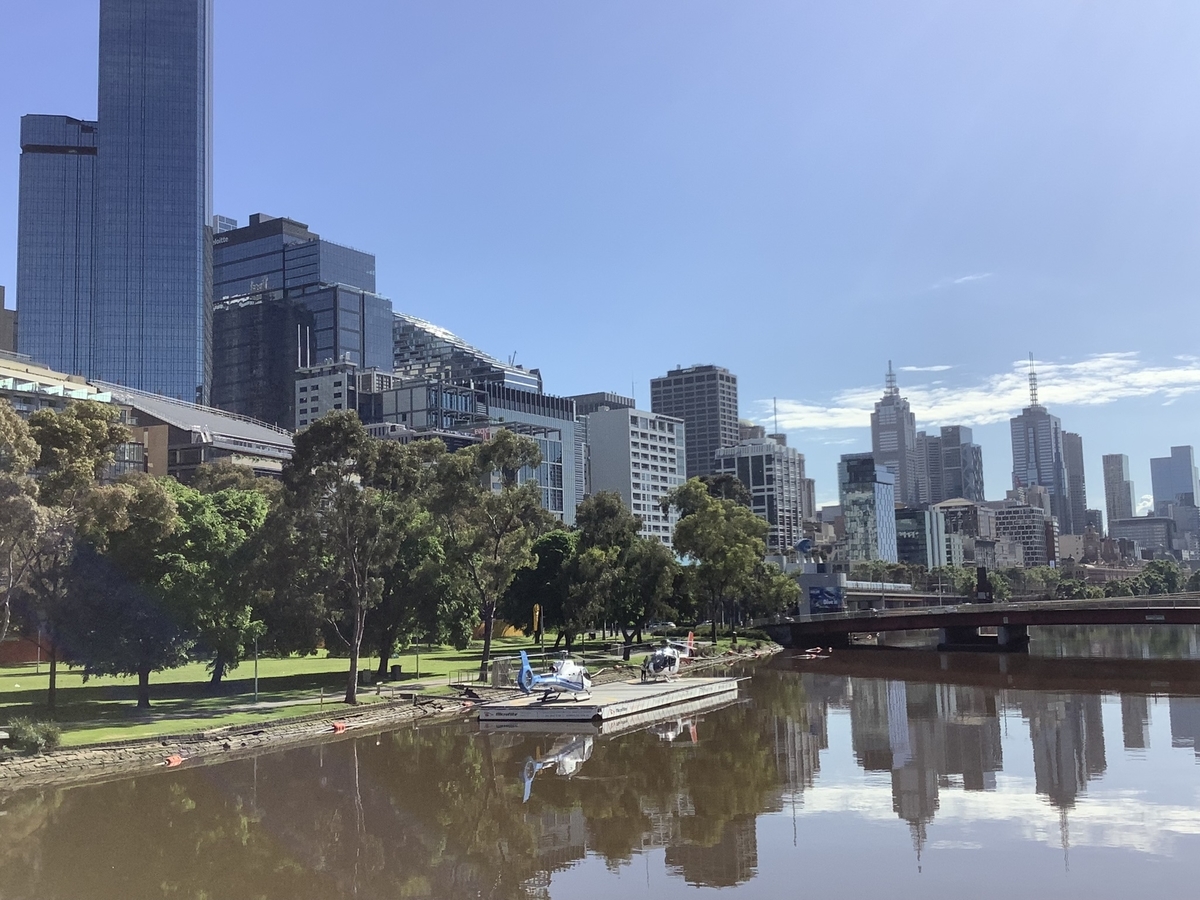 ヤラ川の河口まで来ました!ヘリコプターが🚁