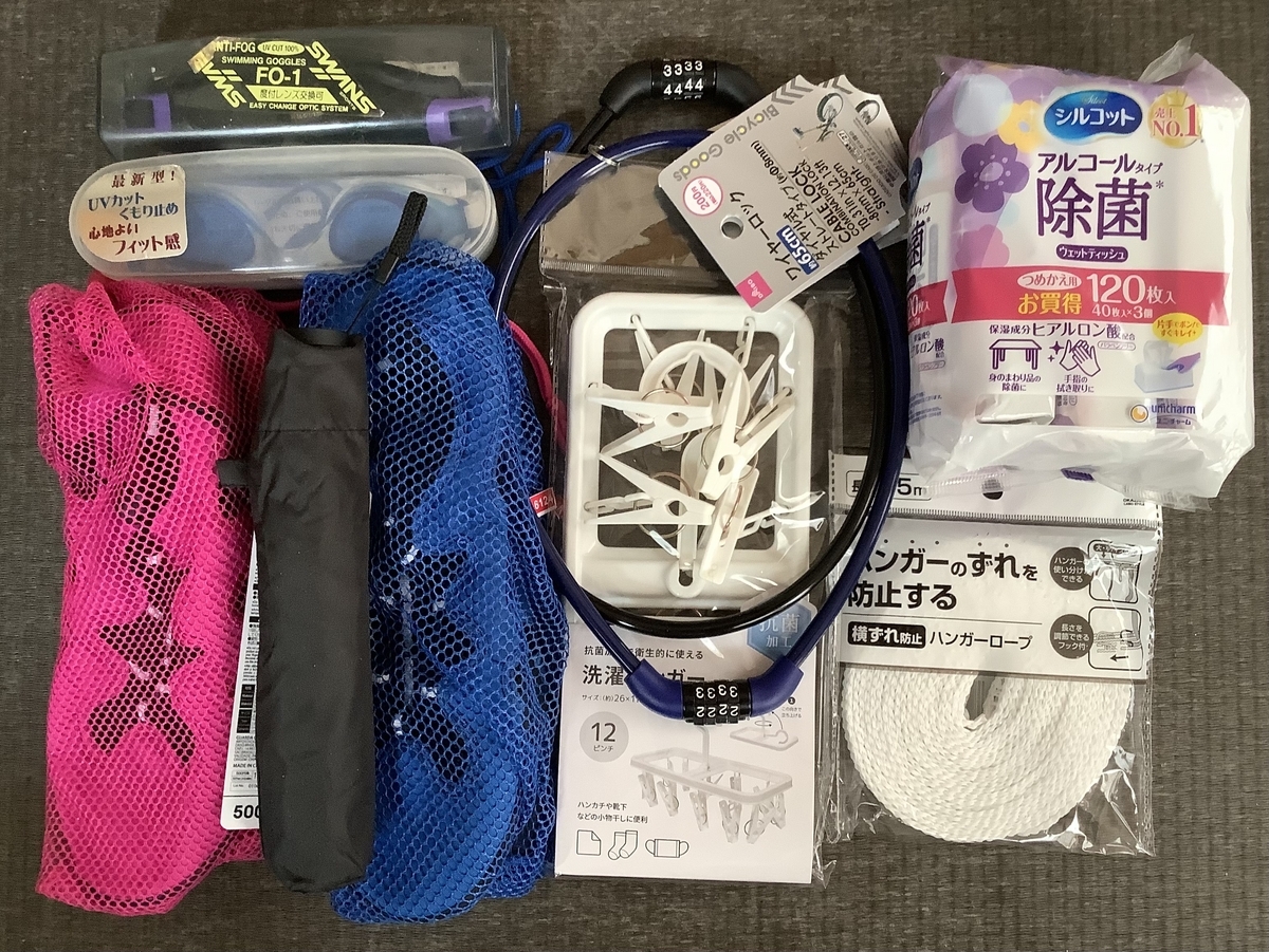 洗濯関連や折り畳み傘、自転車のチェーン、ビーチシューズ、除菌シートなど