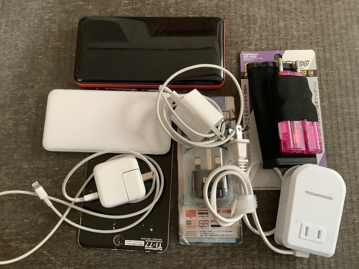 モバイルバッテリーは大小2、延長コードや世界で使えるコンセントなど、、