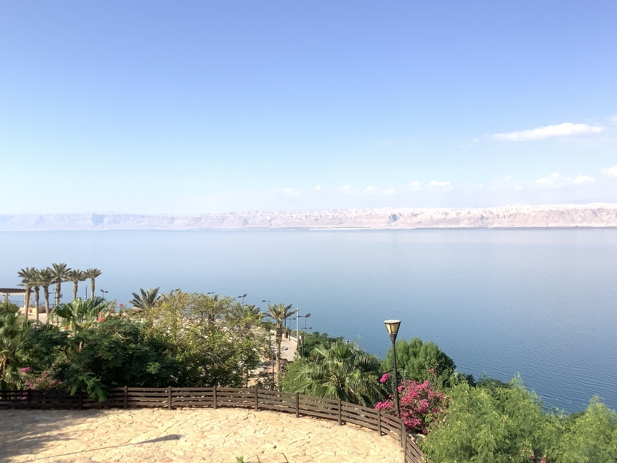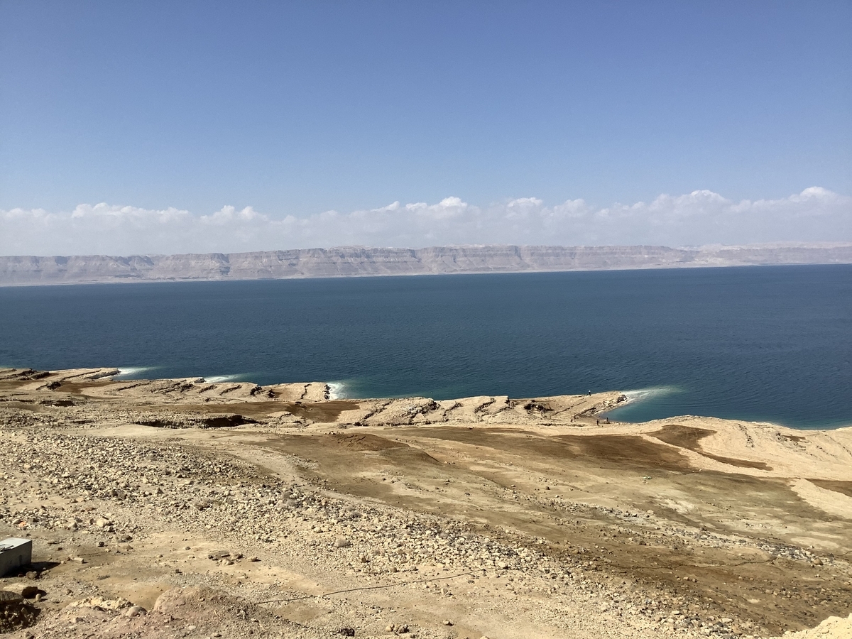 死海の対岸にはイスラエルの大地が、この雄大さは写真では伝わりませんね